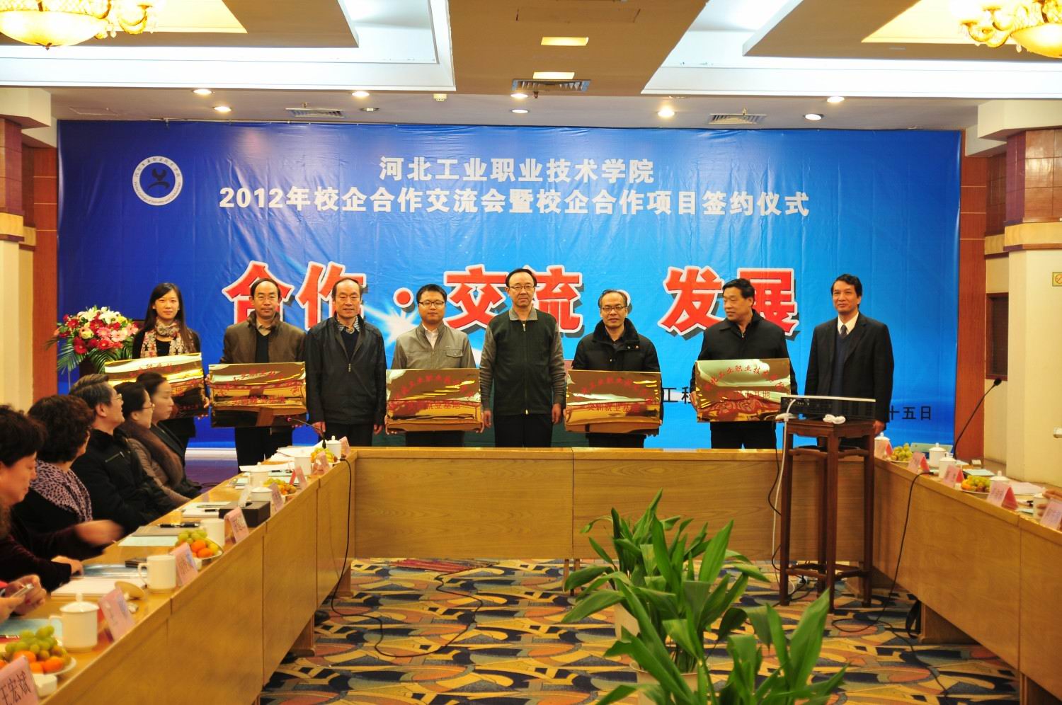 12月15日,我院机电工程系“2012年度校企合作交流会暨校企合作项目签约仪式”隆重召开。会议特邀河北省人民政府国有资产监督管理委员会政策法规处杨佺副处长、石家庄市发展和改革委员会服务办市场处王九思处长、河北省机械行业协会信息部王京艳主任、中国人民解放军第三三零二工厂党委邓萍书记、中国电子科技集团第十三研究所副总工程师何庆国先生、中国兵器工业集团凌云集团河北太行成型设备有限公司何树忠董事长、长城汽车股份有限公司技术研发部鲁立强部长、石家庄纺织机械有限公司侯建明副总经理、石家庄金刚内燃机零部件集团有限公司人力资源总监韩杰先生、南车集团石家庄车辆有限公司王宏斌副总经理等近30位来自政府、行业、企业各界的代表参加会议。学院王建刚副书记、付俊薇副院长、王世龙副院长出席会议,教务处、就业指导中心负责人参加了会议。