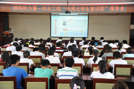 报告会上,共5位榜样代表进行了展示和宣讲,他们分别是身残志坚榜样——建筑工程系2010级室内设计班刘成;全面发展榜样——机电工程系2010级汽车技术服务与营销班杨东;自强自立榜样——环境与化学工程系2010级生化制药技术班李会如;拼搏进取榜样—— 信息工程与自动化系2010级电气自动化技术2班王珊珊;刻苦学习榜样——计算机技术系2010级图形图像制作班刘金格。他们朴素的语言和生动的事迹深深打动了现场的所有人,在学生中引起了强烈共鸣,赢得了阵阵热烈的掌声。