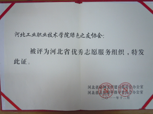 近日,由河北省省委倡导,河北省精神文明建设委员会、河北省志愿服务指导委员会主办的“河北省优秀志愿服务组织、优秀志愿者”评选结果出炉,我院绿色之友协会在全省近300个参评社会组织中脱颖而出,获得“河北省优秀志愿服务组织”荣誉称号。