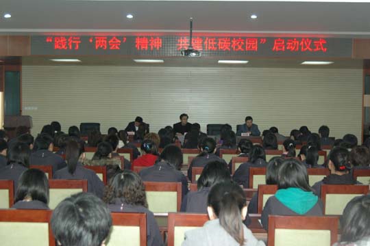 3月30日下午,“践行‘两会'精神 共建低碳校园”启动仪式在南校区报告厅举行。院工会、团委负责人、各系团总支书记、辅导员、160名学生代表参加了启动仪式。