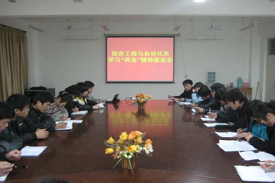 3月18日下午,院学生会全体委员和系学生会代表召开座谈会,一起学习了温家宝总理的政府报告,认真领会“两会”精神;环化系、自动化系、计算机系分别就发展“低碳”经济、开发新能源、互联网与大学生成长等“两会”热点问题召开座谈会;同学们联系自身专业与特长,发表观看“两会”的心得体会,有的同学还对某些议案内容进行剖析。不少同学还在学习讨论中表示,“两会”报告催人奋进,能让青年大学生更清楚地了解国情,更好地关注未来,要把“两会”精神贯穿到学习生活工作中去,不断提升自己的能力,为学院发展、为将来报效祖国打下坚实的基础。其他各系也纷纷开展了形式多样的“两会”学习活动。