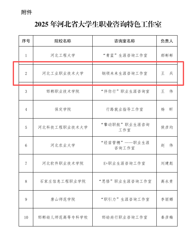 近日,河北省教育厅公布了2025年河北省大学生职业咨询特色工作室遴选结果,我校“钢领未来”生涯咨询工作室入选。