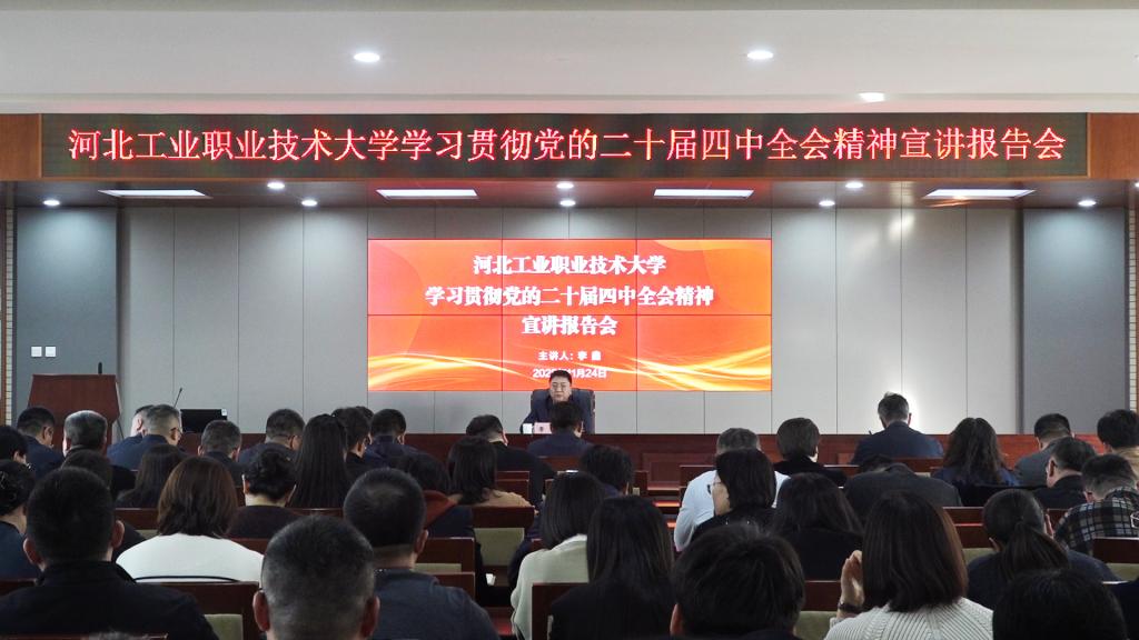 11月24日下午,我校在红旗校区办公楼五楼报告厅举行学习贯彻党的二十届四中全会精神宣讲报告会。党委书记李鑫作专题宣讲。学校领导班子成员,党委委员、纪委委员、全体中层干部、基层党组织书记、政协委员和民主党派代表、新入职教师和学生代表参加报告会。