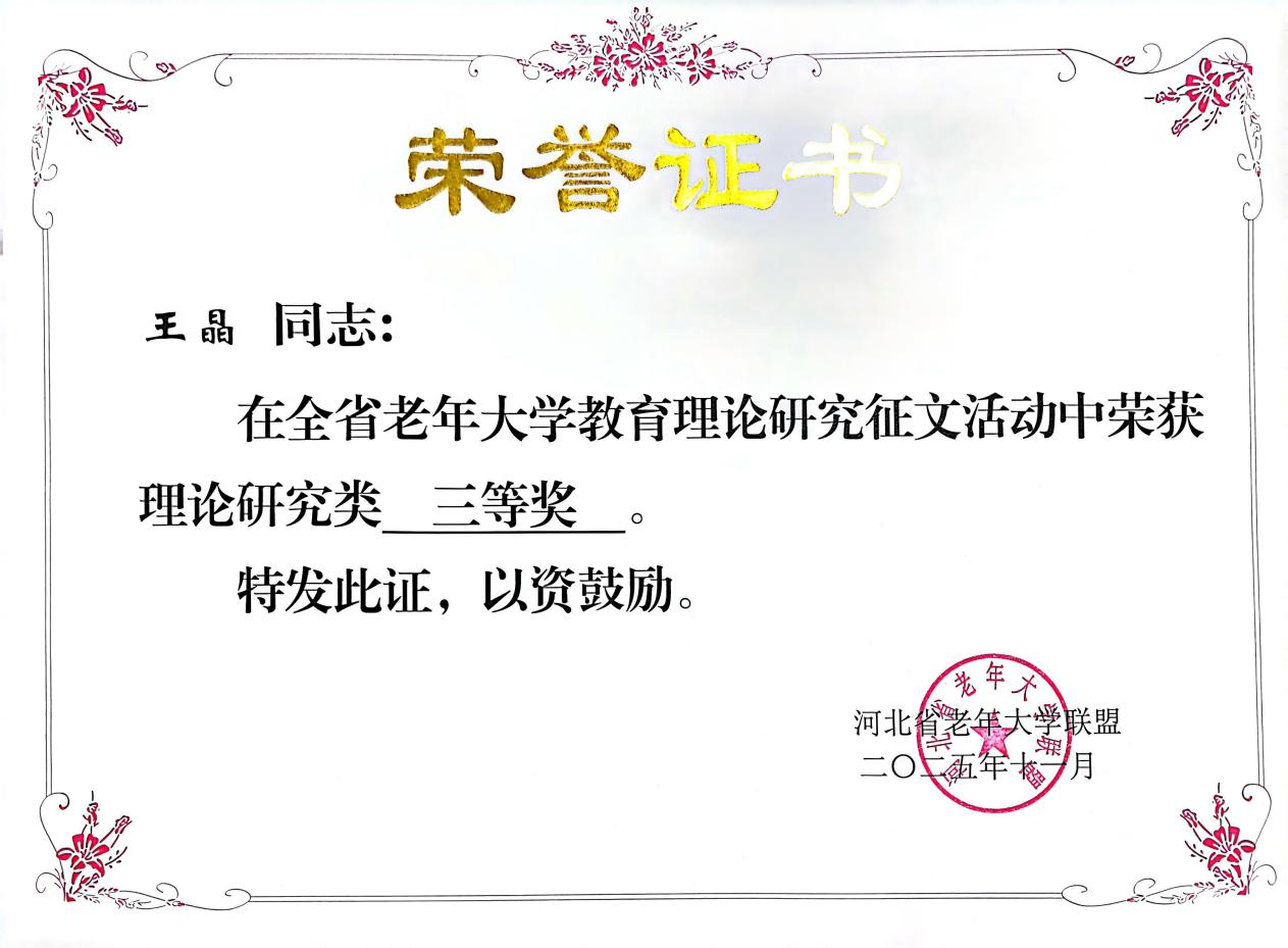 近日,河北省老年大学联盟公布了2025年老年教育理论研究征文活动评选结果,我校老年教育部王晶老师撰写的《“数字鸿沟”背景下城市社区老年智能技术教育的路径探索——特征、困境与对策》和陈媛老师撰写的《心怀大我,情暖银发:老年教育中的教育家精神探索》双双荣获理论研究类三等奖。