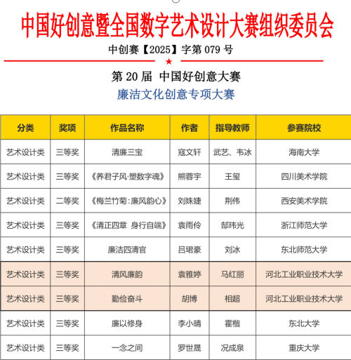 我校积极组织学生参赛,将赛事作为检验教学成果、锤炼学生实践能力的重要平台。在指导教师的悉心指导下,参赛学生深入挖掘廉洁文化的思想内涵,将“清风正气”“勤俭奋斗”等抽象价值理念转化为生动直观的视觉艺术作品。其中,袁雅婷同学的设计作品《清风廉韵》(指导老师:马红丽)、胡博同学的设计作品《勤俭奋斗》(指导老师:相超)均荣获国家级三等奖。这两件作品创意独特、设计精良,体现了思想性、艺术性与技术性的有机统一,获得了评审专家的认可。
