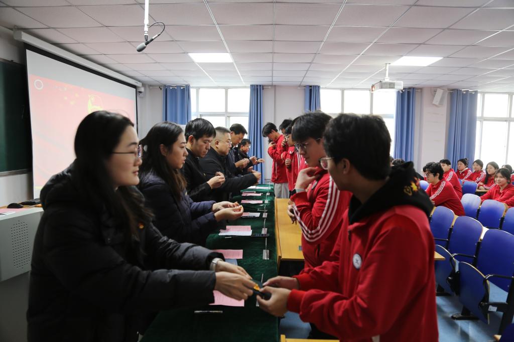 在整个培养发展过程中,学校始终将思想引领放在首位,集中组织400名入团积极分子开展系统理论学习,通过《中国共产主义青年团团章》《学习中国共青团光辉历史》《学习贯彻党的二十届四中全会精神》等8课时团课,实现理论教育全覆盖,帮助青年学子在学习中感悟共青团的初心使命,坚定跟党走的信念。为检验学习成效,学校统一组织推优考试,以考促学、以考促悟,确保新发展团员政治素养过硬。同时,通过召开各学院支部大会、举办志愿书填写专题讲座等形式,进一步细化工作流程、明确标准要求。在入团宣誓仪式上,新团员身着整齐服装,面向团旗庄严宣誓,铮铮誓词既展现了青年一代的理想抱负,更彰显了他们坚定不移听党话、跟党走的坚定决心。
