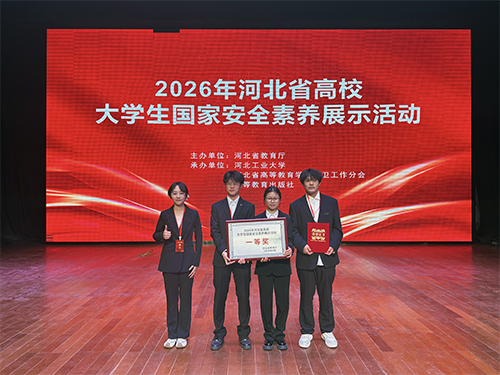 为深入学习贯彻习近平总书记总体国家安全观,切实提升大学生国家安全意识、法治素养和实践能力,4月10日,由河北省教育厅主办的国家安全素养展示活动在河北工业大学北辰校区顺利举行。我校精心组织,最终由智能制造学院的申浩杰、刘清佑、董彪、杜洪翰4名优秀学子组成国家安全代表队参赛,凭借扎实的知识储备与出色的现场表现,荣获本次活动一等奖。