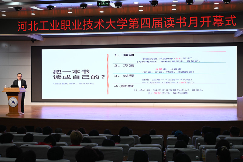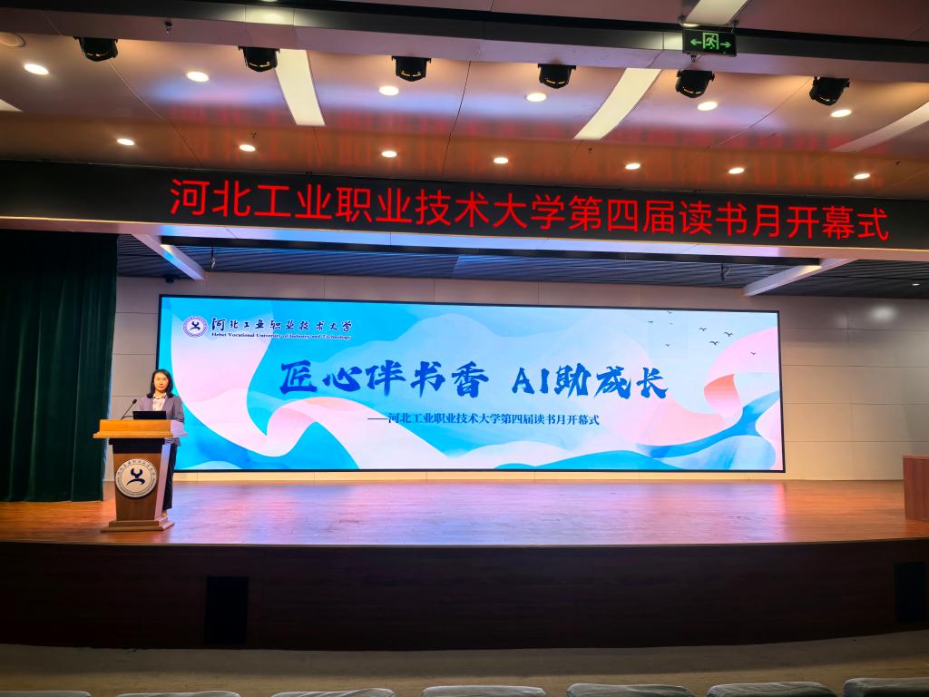 4月23日,河北工业职业技术大学“匠心伴书香・AI 助成长”第四届读书月开幕式在图文信息中心一楼报告厅举行,500余名师生代表参加活动。