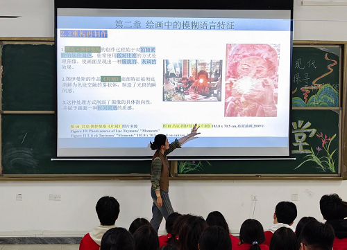 讲座伊始,董老师以美术史发展脉络为线索,围绕“绘画与文明的视觉对话”展开通俗讲解。从早期绘画的宗教描摹与现实记录切入,依次梳理了西方绘画的流派演变。并结合自身研究方向,分享了“模糊性绘画”的表现形式,这种绘画打破了传统清晰轮廓与明确叙事的框架,以朦胧的色彩晕染、含蓄的笔触肌理传递多重解读可能。引导同学们了解现当代绘画“观念先行”的特点,让学生们直观感受到绘画艺术的魅力,并在生活中提高自己感知的能力,感知美、了解美、探索美。